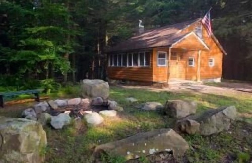cabin borders a hemlock forest with the sight and sound of a rolling