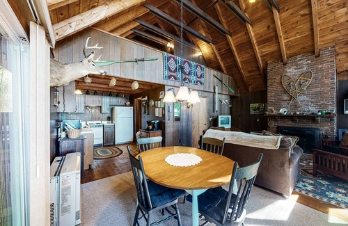 Inside, the cozy cabin atmosphere will have everyone slipping into relaxation mode next to the warmth of the wood-burning fireplace. Don't worry about having to head out for meals because the well-equipped kitchen awaits the group's chef with all of the major appliances, cookware, and utensils needed to create all of your favorite recipes with ease. Not to mention, the living area has a TV and plenty of seating for everyone to enjoy a movie night before hitting the hay.