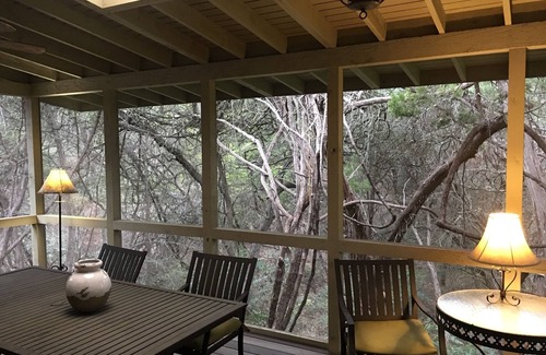 Enjoy secluded “Tree House” living, just 6 miles from downtown and 3.2 miles from The Dell Match Play, not to mention the many surrounding shops and restaurants! This home will comfortably sleep 5, with 3 bedrooms and 2 full baths (1 king bed, 1 full bed, 1 full sofa bed). Open concept kitchen (with all the necessities) and living area includes a wood-burning fireplace. The attached screen porch and deck, overlooking mature shade trees and creek, provide private space to enjoy with family and friends. This property is child and pet-friendly…crib and high chair available upon request.