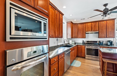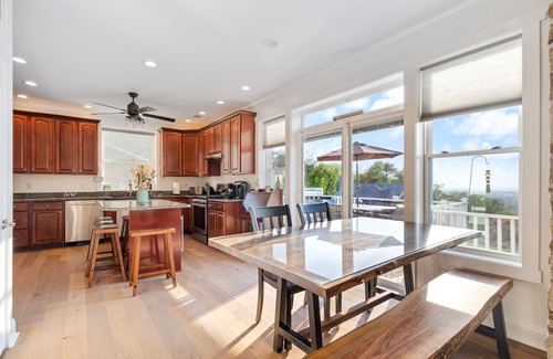 A large, well-appointed "chef- style" kitchen containing both cocktail and coffee bars and a skylight! Plenty of counter space and 42” cherry cabinets, a large sink, dishwasher, two ovens, a gas range, a large island with seating, French door refrigerator with icemaker and separate beverage fridge. Kitchen contains higher-end appliances and cookware, dishes for 8, spices, and large handcrafted black walnut (tree harvested from property) farmhouse table with seating for 8. A sliding glass door sandwiched between two large windows leads out large front deck and opens the kitchen and living room to incredible views and natural light throughout the entire day. See guidebook for a full inventory of kitchen equipment. Host provides initial dish soap, hand soap, dishwasher soap, laundry soap, coffee (K cups), coffee filters (drip coffeemaker) tea, sweeteners, and creamer cups.