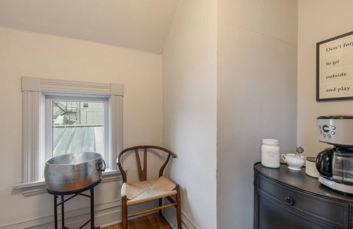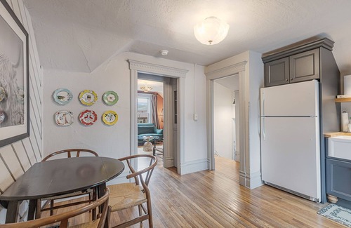 Located just off Missoula's vibrant Hip Strip and across the Clark Fork River from historic downtown, Maida Vale Flats is within walking distance to the University of Montana, the Wilma Theater, Caras Park, Montana’s best farmers' markets, and countless local shops, bars, restaurants, breweries, galleries, and more. Built in 1930, Maida Vale Flats preserves its historic character while featuring many updates to enhance comfort. Maida Vale Flats Upper Unit, the second-floor unit in this historic home, features 2 bedrooms (one king bed, one queen bed), a cozy living room with a beautiful view of Missoula's historic downtown, the Clark Fork River, and the North Hills, a fully equipped kitchen and dining nook, a south-facing sunroom , and full bathroom (shower only) with shampoo, conditioner, body wash, and a hair dryer. In the spring, summer, and fall, you can take your coffee or evening cocktail out on the covered deck and enjoy the view from the living room outside.