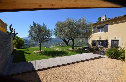 Imagine... Once through the heavy gate, you are left speechless in front of the panoramic view that is offered to you from the garden where 2 olive trees and a hundred-year-old almond tree stand majestically. A grey wooden driveway winds through the lawn and invites you to head towards the house and its terrace conducive to long summer evenings... an ideal vantage point from which to admire the sumptuous sunsets that plunge into the distance, all over there behind the silhouettes of the bluish mountains of the Pre-Alps of the south.