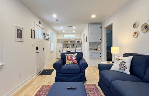 This cozy two-bedroom, one-bath cottage features central heat and air, a fully-equipped kitchen, a coffee bar, and a sleek curbless shower. Stay connected with high-speed internet and enjoy entertainment on the Smart TV. The space is thoughtfully laid out, making it both functional and inviting.