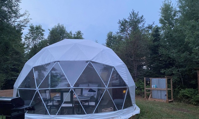 Enjoy this beautiful romantic secluded yet kid friendly spot in serene nature with unforgettable views. Cozy garden on a 189 acre equestrian farm located minutes from the Elmvale Zoo, 1.5 hours from Toronto and a short drive to some of Ontarios most exciting beaches and family attractions. A fun place to “glamp” where you’ll find acres of trails - miniature horses - polo horses - ducks - turkeys - bunnies and our friendly chickens who will greet you on arrival with farm fresh eggs to enjoy during your stay ! Enjoy the outdoor kitchen and shower and all the creature comforts of home while situated by a quiet babbling stream. This is the perfect getaway for couples or small families but if your group is larger you can pitch a tent right beside the dome ! ALL five star reviews and a “guest favorite” on other popular platforms - this dome experience will be memorable for sure:
