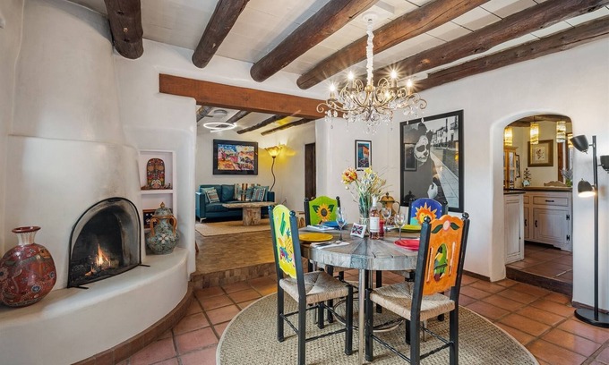 The living room is located between the two bedrooms and is furnished with high-end and eclectic furniture that offers ample seating for your group to gather. The living room opens into the dining room, which seats four, and features a gorgeous kiva fireplace. A large picture window looks out into the garden.