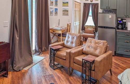 Inside, The Secret Squirrel Sanctuary features a simple yet comfortable setup. The main room includes a queen bed and two chairs, along with a full bathroom featuring a tub. A kitchenette equipped with a toaster, crockpot, electric skillet, and microwave allows guests to prepare meals at their convenience. The dining area offers a table with two stools, while the living area includes two cozy chairs and a smart TV.
