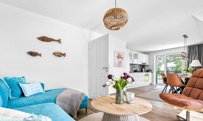 The light-flooded living area is equipped with a cozy living area including a sleep function (250x160cm) and a flat-screen TV. The adjacent kitchen is open-plan and offers all the amenities needed for a convivial cooking evening. At the dining table with comfortable chairs you can comfortably eat together or spend a game evening. From here you can access the fully furnished balcony. Both bedrooms have a double bed (180x200 cm) and blackout options, one bedroom also has a smart TV. The bathroom is equipped with a walk-in shower, a toilet and a sink. There is another bathroom in the top floor with a toilet and a sink.
