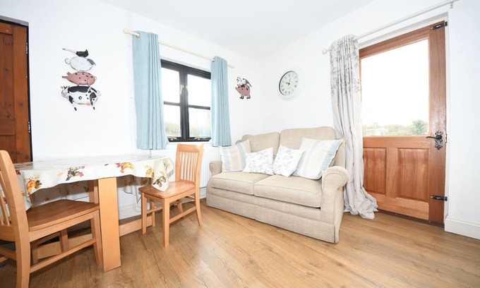 This is a self contained conversion on the farm that is away from the main house. It comprises of an open plan kitchen and lounge with a full working kitchen with all facilities, flat screen television and table and chairs. A double bedroom with en suite bathroom. Fully central heated with underfloor heating in the bathroom.