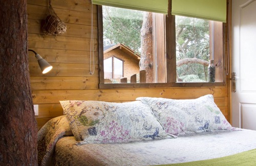 Cabin built on top of a tree with capacity for two adults and up to three children.