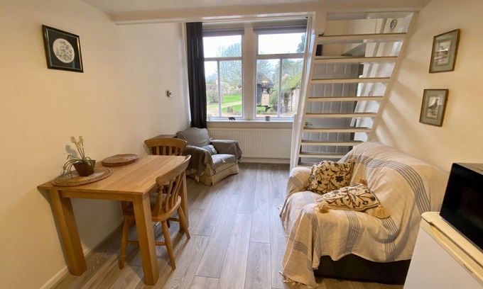 The Studio Cottage is situated down a secluded drive in our village (Cholderton) & is within its own stable yard (without horses), so affords privacy. The property offers "no-frills" accommodation and is quite rustic in style: N.B. the bedroom is "studio-style" , with eaves, & is up steep steps from the living room, hence is unsuitable for small children or those of advanced years (please see photos). Outside it has its own patio with table & chairs. There are extensive walks on hand, including 2 to local pubs and many on nearby Salisbury Plain. Stonehenge is 5mins drive away and the historic city of Salisbury a 30min drive.