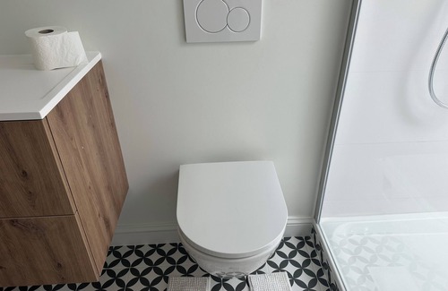 This apartment also includes two bathrooms, offering convenience and ample space. The full bathroom is well-appointed with modern fixtures and a relaxing atmosphere, while the additional WC is perfect for added privacy and convenience during your stay. Both spaces are designed with comfort and ease in mind, ensuring you’ll always feel at home.