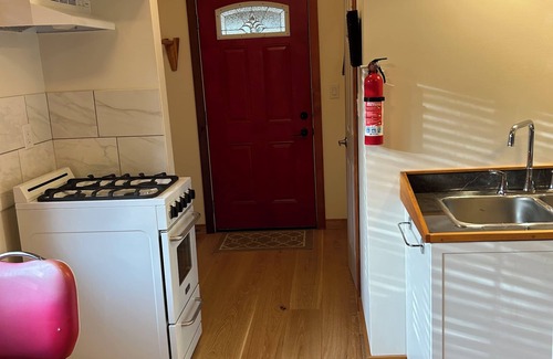 Located on a very quiet street, and nestled in the trees, this suite is perfect for a couple and 1 child, or 3 adults. It has a fold out couch in the living room. Comes with a full bath including tub and shower, and a full kitchen. Has high speed internet and cable tv. The suite has everything you need except food to stay comfortably for a few days or weeks. Also a private deck and BBQ, chairs and a small table.