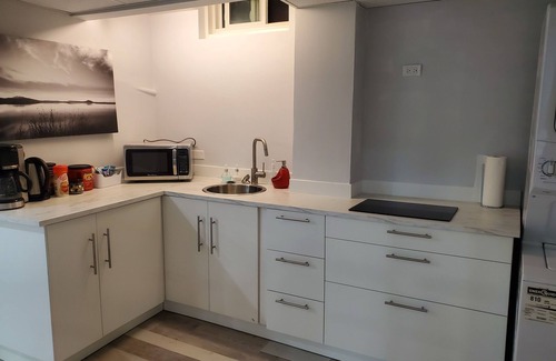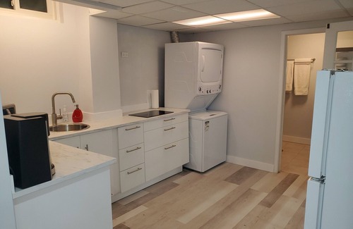 Modern, cozy, newly renovated self contained basement apartment with private entrance and access to backyard. So bright, you cannot tell it's a basement. 1 bedroom, 1 living room (including day bed), full bathroom. WiFi, free parking on driveway, laundry, full kitchen.