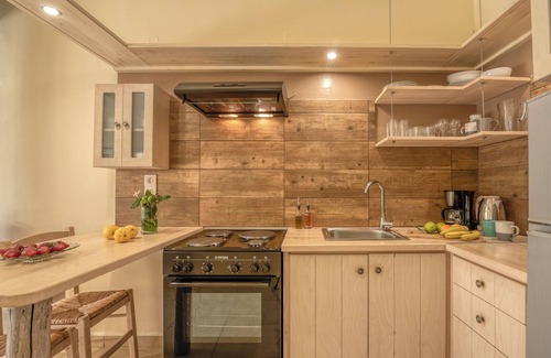 Seli Village House is a beautiful traditional stone house for 6 persons situated in a small picturesque village in the western part of the magical island of Crete and was originally built in 1730. The residence name is inspired by the location of the building. This specific neighborhood of the village Kampos was known as “Seli” which means horse saddle in Venetian language (“cella”) and describes the hills shape on which it is built on. The house is completely renovated and modernized in 2017 with a lot of respect and love to the traditional details. The ground floor, Apartment Anaxagoras (a studio for 2 people), is characterized by an original Venetian style arch which in an open space arrangement divides the living from the sleeping area. From here you have the direct access to the romantic garden area with big dining table, sun loungers and BBQ. The upper floor, Apartment Chrysi, with its two bedrooms for 4 people offers a wide valley view until the sea. Feel free to enjoy this breathtaking nature panorama while having a relaxing bath in your Jacuzzi.