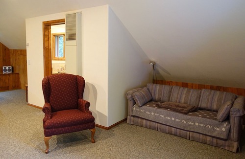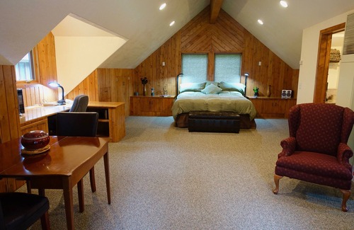This studio loft with a deck overlooks the pristine Selway River, amidst cedar trees and ferns. The immersive 24/7 river noise can either charge your senses, or lull you to sleep. This setting is ideal for active adventurers who raft, hike, swim, fish or bike, as well as for the sedentary seeking tranquility in paradise. This unit is completely separated from the main house and features a king-sized bed with full river view, sleeper-sofa, bathroom with a shower, dinning table, office desk and a deck with outdoor kitchenette.