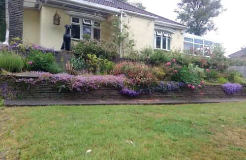 What ever the weather, the whole group will be comfortable in this spacious and unique quirky space. 3 double bedrooms, 2 double sofa beds, 2 single "Zed" beds, One family bathroom and one ensuite shower room and a separate WC. The huge conservative has a full size table tennis table, a pool table and other games. Outside is a very large garden and bbq, the driveway has parking for 10 cars. Surrounded by countryside, yet only 20 minute drive to the city of Cardiff, with bus stop just outside and train station in the town.