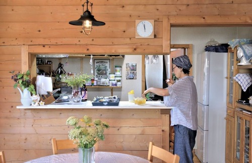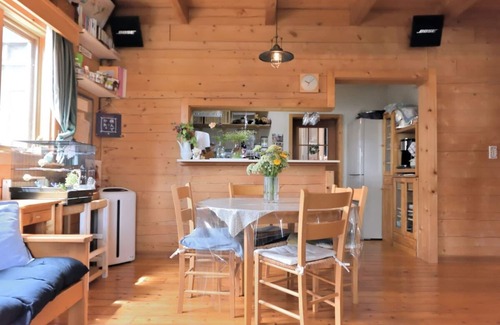 / A log house with a wood stove and a simple band studio The bath half unit is for guests only