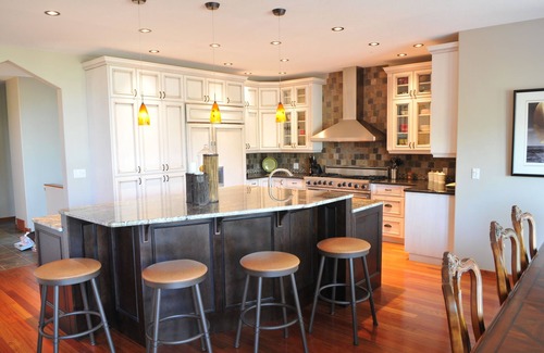 This luxury cabin is a 3,800 sg ft 4 bedroom walkout with high end finishes throughout including sub zero fridge & professional Viking stove. Situated on a 1 acre lot with mountain & lake views, it is air conditioned, has a large deck spanning the width of the house, outdoor 6-7 person private hot tub, indoor & outdoor wood fireplaces & Weber BBQ. Private dock with protected moorage is included. Children & pets welcome (pets must be house trained).