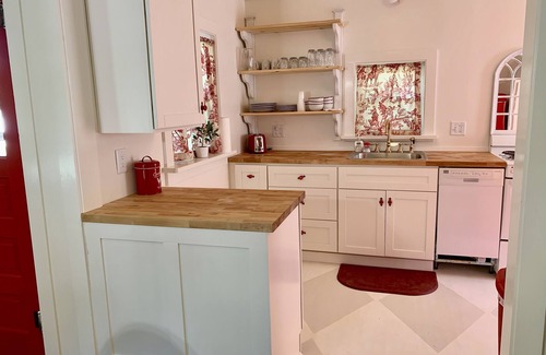 Complete Brand New Remodel of Long-Time Nauvoo Family's Home. Sweet and Tastefully done in whites and reds. All new plumbing and finishes in the bathroom and kitchen. This home is within walking distance to the Temple, Post Office, City Park and all the wonderful shops on Mulholland! New beds, linens, and towels will assist in a comfy stay. New Stackable Washer and Dryer in kitchen. Smaller size range and dishwasher, microwave, new fridge. There is one bedroom with 1 Queen; one bedroom with 1 Queen & 1 Twin Bed; and a futon sofa for an extra (not the best for long-term sleeping unless for a child). NO TAXES required on 30-days or longer rentals! Well-behaved dog upon approval for extra $100/month. One dog maximum.