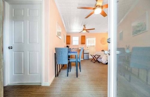 The apartment has Roku TV with Hulu,. The table and chairs comfortably seat 4, or can be used as a workspace. Hair dryer, make-up mirror, shampoo, conditioner, luggage stand, closet, and iron/ironing board, in addition to the kitchen amenities.