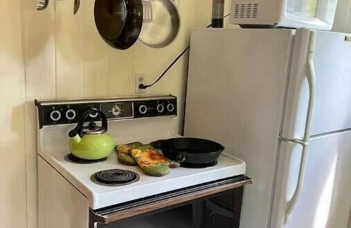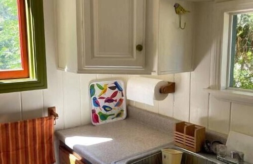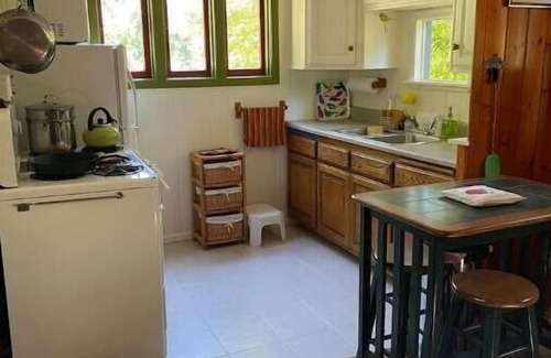 Super cozy and comfortable cabin space. Some vintage items. Some modern items. Hopefully, a perfect blend to take you back and take you away! Relax in the recliner or loveseat with a good book; choose from lots of puzzles to put together on a card table; deck cards and some games available too; or watch lots of movies in the bedroom with the DVD player. Make popcorn in the microwave, on the stove, or even the wood stove! Shady, backyard deck with patio furniture is the perfect spot for wining or dining—looking out onto the unique landscape combination of mountain trees and terrain, and garden grounds; a grassy area trellised with grape vines is perfect for small dog or kids. Plenty of spots to sit and soak in the outdoors—under the apple tree, on a log bench near the small redwood grove and creekside Adirondacks.