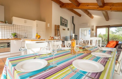 "Serapias", 5-room house 150 m2 on 2 levels. Comfortable and cosy furnishings: living/dining room with Scandinavian wood stove, dining table, satellite TV and air conditioning. Exit to the terrace. 1 room with 1 french bed and air conditioning. Exit to the garden. 1 room with 2 beds and air conditioning. Exit to the garden. 1 room with 1 french bed (160 cm), bath/WC and air conditioning. Exit to the garden. Open kitchen (3 hot plates, oven, dishwasher, toaster, kettle, microwave, freezer, electric coffee machine). Shower, sep. WC. Upper floor: 1 room with 2 beds, 1 sofabed, shower and air conditioning. Exit to the garden. Electric heating, air-conditioning. 2 terraces. Terrace furniture, barbecue, deck chairs (6). Facilities: washing machine. Internet (WiFi, free). Maximum 2 pets/ dogs allowed. When there are less than the maximum number of guests staying at the property, not all of the bedrooms will be available for use.