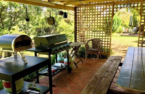 Fully self-contained and spacious the Cottage has 2 x Bedrooms comprising a Queen and 2 x Single Beds. Also available is a Double fold-out Sofa Bed in the living area. The Cottage also features a full-sized working kitchen with dishwasher and dining area, separate lounge room, furnishings, large walk-in shower, powder room, separate toilet, air/con, gas log fire heater, electric blankets, 50" Smart TV with Netflix, DVD player, Bluetooth music system, Free WiFi, laundry and ironing facilities. Varieties of tea, plunger coffee, basic pantry items, milk & cereal. Outdoor undercover area with BBQ & Pizza oven. Five-slot bike rack. All linen is provided.