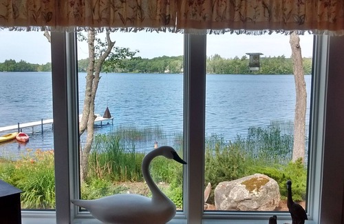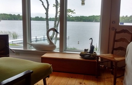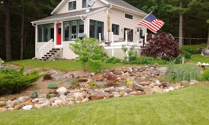 Though small in stature, this cottage is large in space, with beautiful vistas & solitude. With its 300 feet of shore frontage, dock, beautiful gardens, rock lined streams & lawn area for play, you will delight both inside & out. There is easy access for kayaks from the shore with lots to explore on the pond. & the water is great for swimming. Minimum stay for Off-Season rentals is flexible.