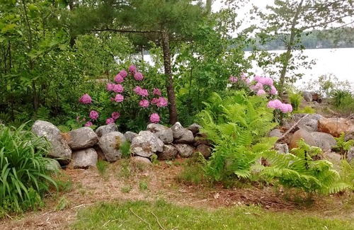 The deck, rimmed with overflowing flower boxes, has a comfortable seating area, dining table and gas grill along with a huge umbrella for our rare hot days. The forty foot dock has chaise lounges to relax on and side tables to set your coffee mug or wine glass on while you watch ducks, loons, eagles and the ever entertaining chickadees. Also a great place to cast your line and catch a nice trout for dinner. Be sure you get your fishing licence from the Hope Town Office. There are perennial gardens, stone lined brook and generous lawn area for the kids to play and shaded dining area by the woods where you can enjoy lovely breezes coming over the water, whispering through the trees.