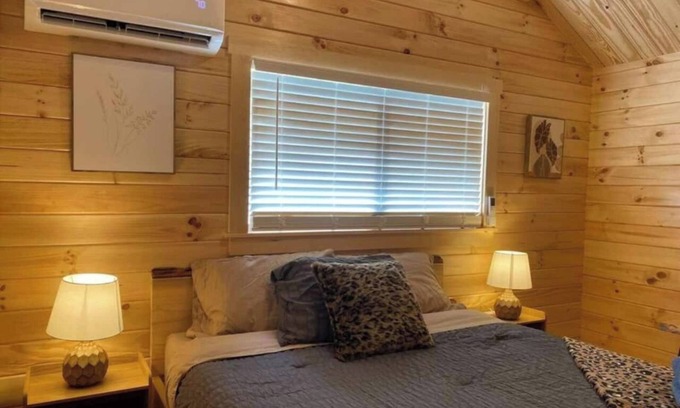 This cozy cabin offers comfortable accommodations for guests with its spacious one bedroom with a plush queen bed. It also offers a bunk bed in addition to the 2 single beds in the loft and a comfy reclining couch. Rest assured with air conditioning, ensuring the ideal temperature for a tranquil rest, regardless of the season.