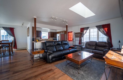 This charming house is equipped with modern amenities to ensure a stress-free stay. You will find a large living room featuring a 70" smart TV and reclining couches, perfect for cozy movie nights after the festivities. The kitchen boasts upgraded stainless appliances, ample cookware, and dining space for sharing meals with friends and family. Enjoy the serenity of nature from your private deck, or unwind by the wood stove during chilly evenings. Additional features include high-quality cotton bedding, free high-speed Wi-Fi, and professional cleaning services, ensuring every detail is taken care of during your visit.