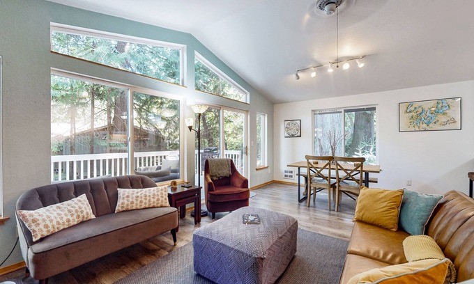 Escape to the serene beauty of Harstine Island with a stay at Harstine House, a cozy cabin-style home nestled in the private and secluded Hartstene Pointe community. This efficient yet functional home is perfect for a weekend getaway, offering cathedral ceilings in the living and dining areas, a nice kitchen, and a wood stove to keep you comfy during your stay. Step outside onto the generous deck, ideal for gatherings and enjoying the spectacular views.