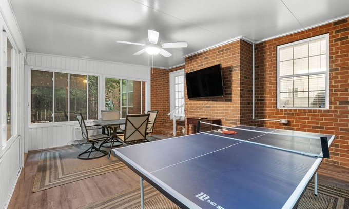 Outside, you'll find a garage, a screened in patio with a ping pong table and tv for some family fun.