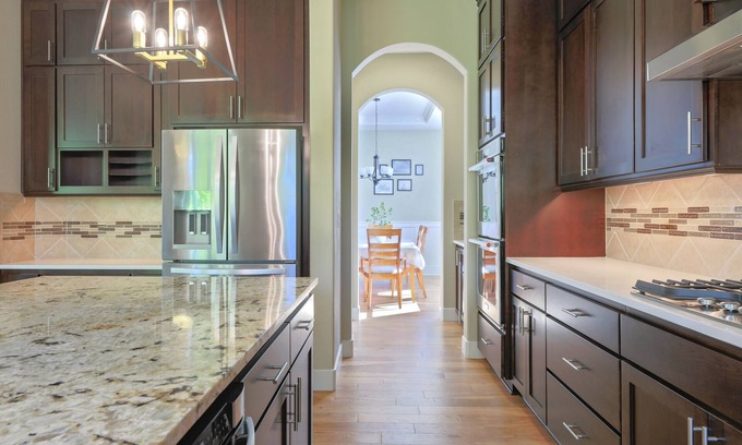 • Remodeled Kitchen Equipped with Granite Counter Tops and a Spacious Center Island