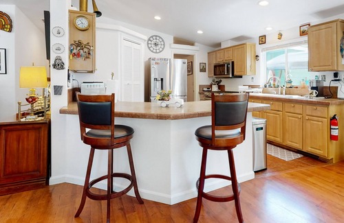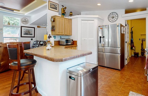 When you need a break from the sun, the home's interior features an open-concept layout, warm wood finishes, and updated amenities. The living room's plush leather seating is situated perfectly in front of a large TV and wood stove, making it the perfect space for late-night movie nights. The adjacent kitchen will delight the chef of your family with its stainless steel appliances, ample meal prep space, and breakfast bar. When you aren't dining al fresco, sit inside and indulge in formal meals at the dining table.
