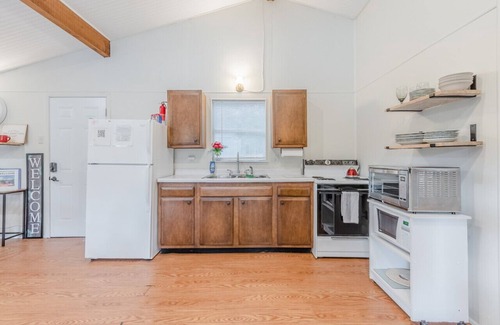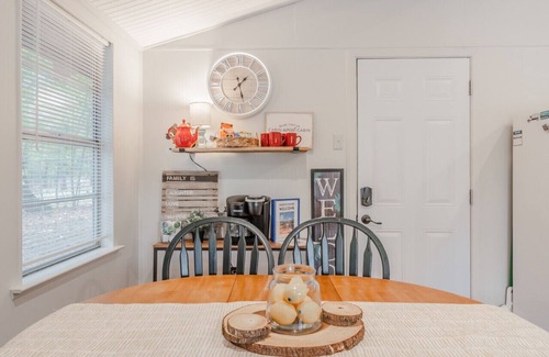 Take it easy at this unique and tranquil getaway. Cabin with serene private lake views from living room and bedroom. Large deck to enjoy the view and enjoy your favorite meal or beverage. Fully equipped kitchen. Quiet and gated community with fishing ponds and many walking trails. Many activities - Enjoy fishing, take the kayak onto the lake, make s'mores at the fire pit, relax on the 2 person hammock, enjoy the trails or play backyard games. A true peaceful retreat from city life.