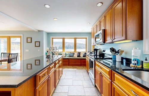 With three inviting bedrooms, it’s ideal for families or groups seeking a peaceful escape. The fully-equipped kitchen features granite countertops and an island for meal preparation, complemented by a cozy living space warmed by a gas fireplace. Take in breathtaking lake views from the deck, gather around the firepit for s'mores under the stars, or enjoy an outdoor dining experience with the gas grill.