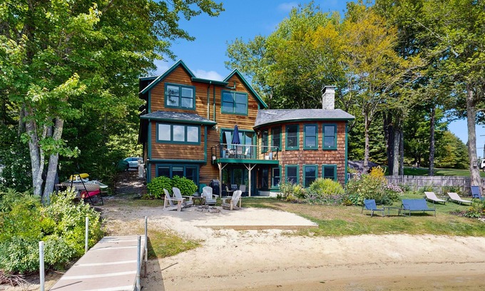Serene Lakefront Lodge with Private Beach, BBQ Grill, Dock and Game Room | House in Casco