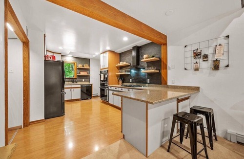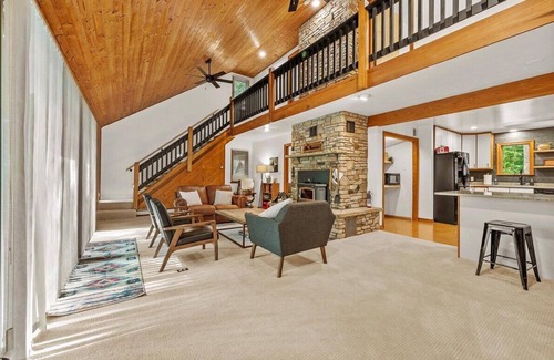 With plenty of space for 8 people to find 'their spot', whether next to the fireplace looking out the sliding glass doors at mountains, by the smart tv with your favorite show, or cooking your go-to meal in the spacious, fully stocked kitchen! It doesn't get much more 'mountain ski chalet' than this! Tucked just off the main road, the goal of this 2700 sq ft chalet is to balance the spaciousness with the cozy feel you want in a chalet. Our living room is the perfect spot for a book or card game by the fire. Off the living room there is an office/bedroom with a memory foam futon and its own bathroom leading out to the airy sunroom with a swing and plenty of windows.