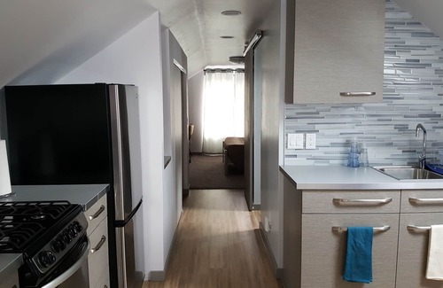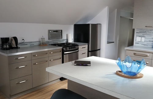 This 700 sf, fully renovated loft is above the main house. It is entirely independent with its own private exterior entrance and fenced yard. It has an open living-dining-kitchen area with a sofa or spare mattress and a bedroom with a queen size bed (latex and organic cotton mattress). The bathroom is very roomy with toilet, sink and shower. Skylights (which are equipped with electric blinds) and color scheme makes the place very bright. The T.V. features Roku and Netflix. The kitchen is fully equipped: gas range, sink, refrigerator, freezer, coffee maker, electric kettle, microwave, trash-recycle. You will find coffee and tea at your disposal. The bathroom has a single vanity, shower and toilet. The bedroom is located at the end of the loft with a big picture window. It has a queen size bed (latex and organic cotton mattress) and a small desk. Bedding and linens are included and always freshly cleaned. Extra queen mattress.