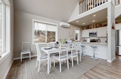 Main Level: 1 bedroom, full bath, open living space with gas fireplace, dining table for 8, and breakfast bar for 4.