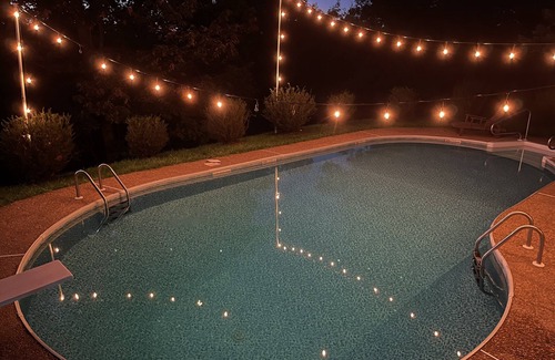 Large Heated In-Ground Outdoor Pool with Hanging Lights for Late Night Swimming
