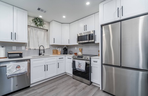 This fully renovated townhouse has kitchen and living space downstairs, Upstairs, there are two bedrooms with their own private and separate bathrooms. One bedroom is equipped with a king bed, 55 inch smart TV and private bathroom, another bedroom is equipped with two twin beds and private bathroom. Thermal blackout curtains throughout the unit.