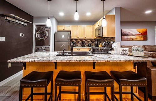 Our home has 2 bedrooms (1 Queen and 2 full beds), Queen sleeper sofa, 2 full baths, sunken living room with wood burning fireplace, open kitchen and dining room area, washer and dryer, playground for children off the back deck, and 2 parking spaces directly in front the townhome.