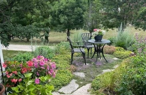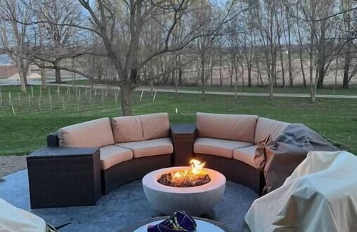 Enjoy this serene space while lounging in the outdoor hot tub or by the gorgeous gas fireplace surrounded by nature after a busy day at EAA. Space for friends and family to create memories. Two large living rooms and a large open concept kitchen flows into the outdoor patio high up in the treetops. Picturesque secret garden front patio overlooks a quaint farmette setting while the back patio overlooks a beautiful vineyard and 5 acres.