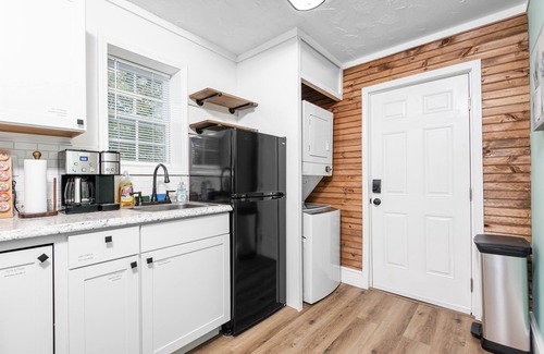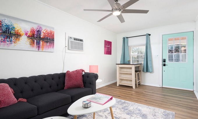 Custom designed by Blue Pineapple Designers, the interior of the home offers a fun and relaxing vibe. The living room has a cozy sofa complete with comfy accent pillows. Catch up on your favorite shows/movies on the room's 55" Samsung Smart TV or enjoy a meal at the dining area. As you make your way down the hall you are lead into the fun and cheery fully equipped kitchen complete with brand new appliances, a pellet ice machine, duel K-Cup/coffee pot maker and basic cookware for your stay. The washer/dryer is located off of the kitchen and includes provided detergent. The bedroom has a Queen-sized bed, remote controlled fan/light and blackout curtains. For anyone looking to do remote work this home has a dedicated office space with desk, lamp and chair. A full bathroom with a tub/shower combo is located in the hallway between the living room and kitchen. Outside you'll find the inviting porch where you can enjoy a drink, good conversation, or the morning sunrise.