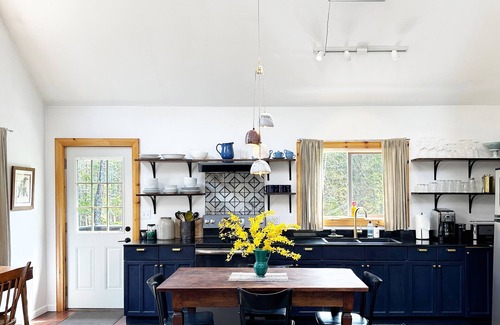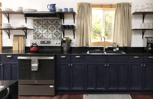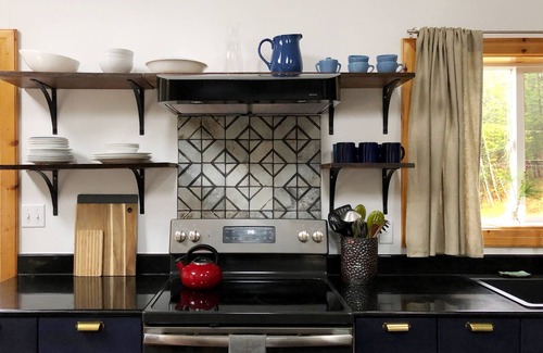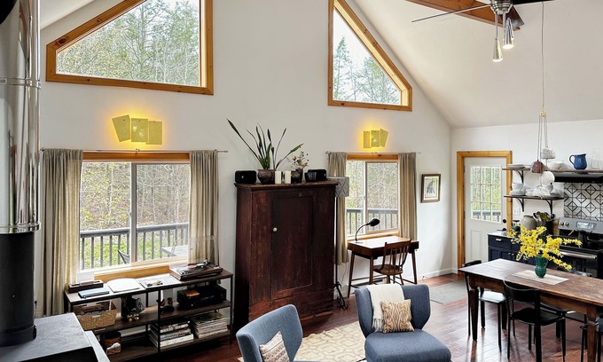 Reconnect with nature in our stylish streamside cabin. Enjoy countryside living with modern design, vaulted ceilings, and picture windows framing the forest. Lounge on the deck, dine under the stars, or cozy up by the firepit. Play records from our vinyl collection in the light-filled living space. Minutes to skiing, hiking, and charming mountain towns for dining and shopping.