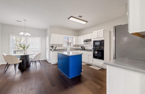 The chef's kitchen boasts granite countertops, stainless steel appliances, and a center island that doubles as a breakfast bar. The adjacent dining area is bathed in natural light, making it an ideal space for hosting memorable meals.