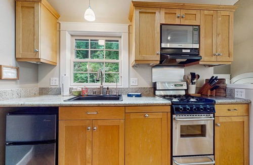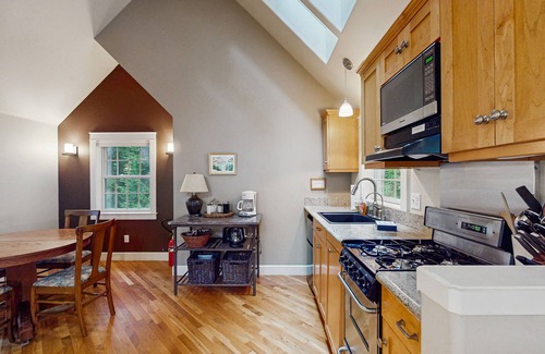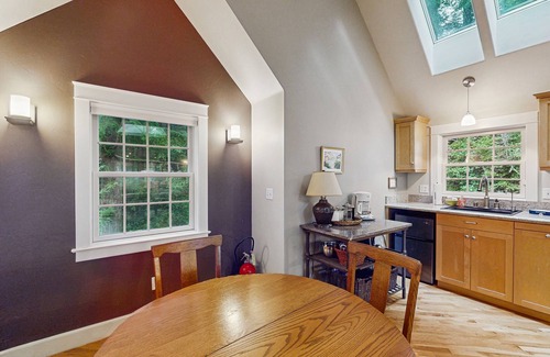 Tucked away among the trees, this serene, upscale home is perfect for an intimate getaway for two. This rental is tastefully decorated and furnished with hardwood floors, radiant floor heating, and soaring ceilings as well as a full kitchen, dining area, and a forested backyard with a picnic table. You really will feel like you are on a private retreat while you are here!