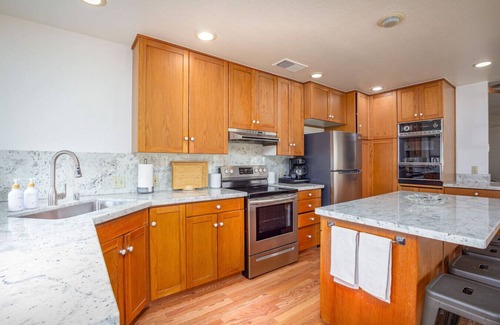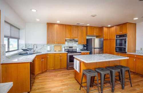 The fully equipped kitchen makes preparing meals for a crowd a breeze, and the large dining area is perfect for enjoying meals together. Natural light floods the space through large windows, creating a bright and inviting atmosphere.